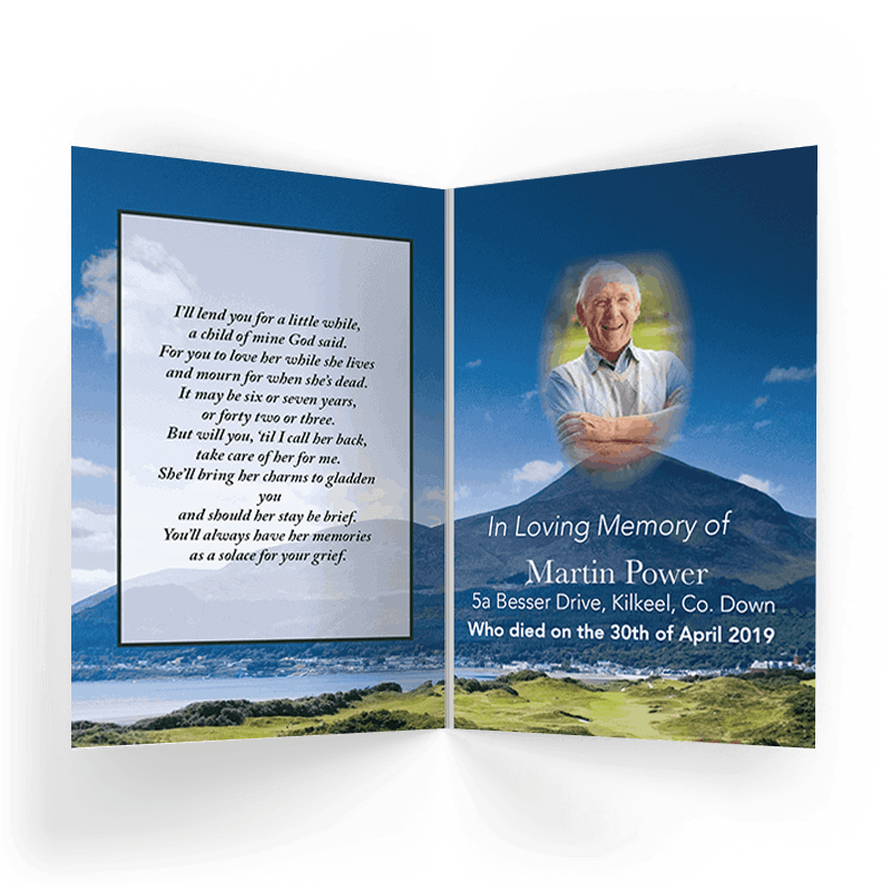 Our Beautiful county Down scenic memorial cards are Printed on the highest quality coated art board and finished with a high gloss laminate.