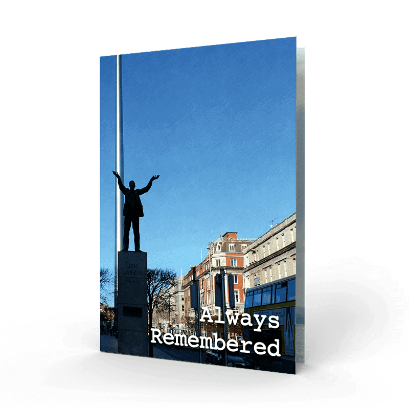 Our Beautiful The Spire / James Larkin O’Connell Street Dublin memorial cards 7 The Spire of Dublin, alternatively titled the Monument of Light on O’Connell Street in Dublin, Ireland Dublin scenic memorial cards are Printed on the highest quality coated art board and finished with a high gloss laminate.