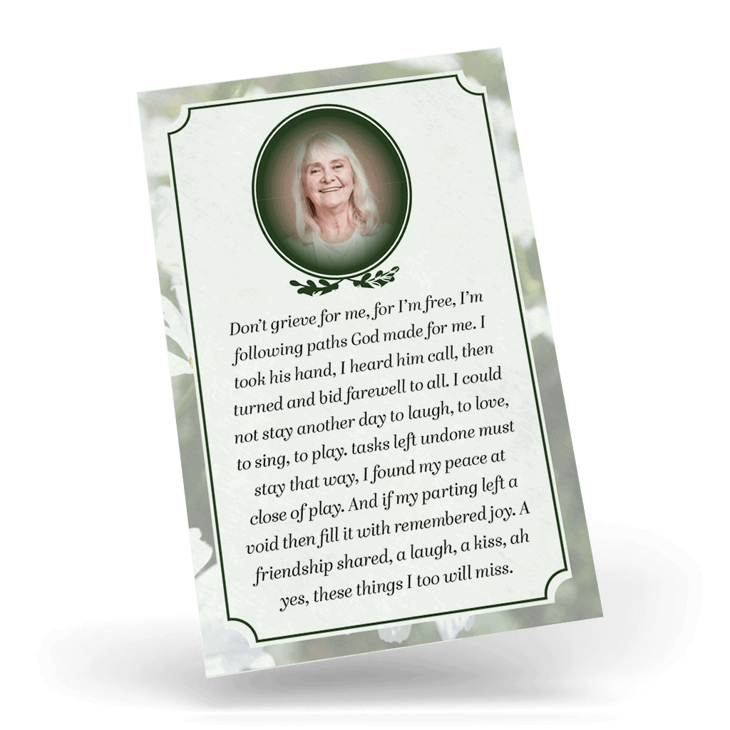 • Our memorial wallet cards are finished to size 55mm x 85mm Tall.