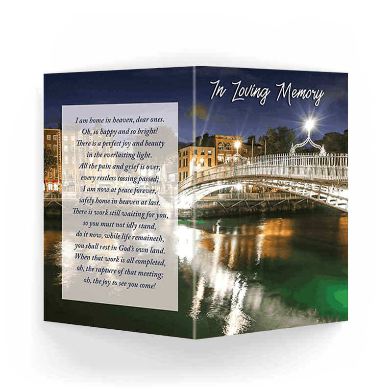 Our Beautiful Ha’penny Bridge memorial card, known officially as the Liffey Bridge, was built in May 1816 over the River Liffey in Dublin, Ireland. Made of cast iron, the bridge was cast in Shropshire, England.[5] The Ha’Dublin scenic memorial cards are Printed on the highest quality coated art board and finished with a high gloss laminate.