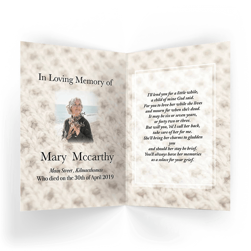 “A Personalised Memorial Card is a popular touching keepsake to remember and pay tribute to a lost loved one. They are a great memory to give to your friends and family and for people who were unable to make the ceremony.”