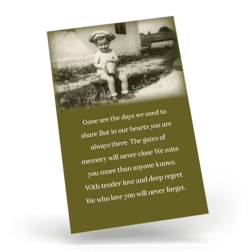 “A Personalised Memorial Wallet Card is a popular touching keepsake to remember and pay tribute to a lost loved one. They are a great memory to give to your friends and family and for people who were unable to make the ceremony.”