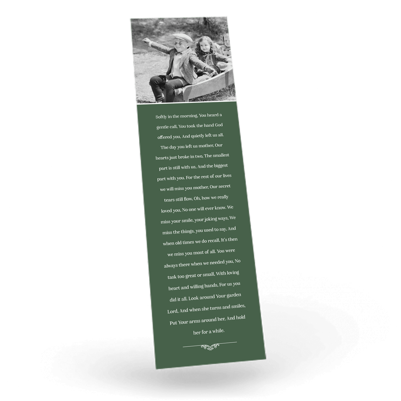“A Personalised Memorial Bookmark is a popular touching keepsake to remember and pay tribute to a lost loved one. They are a great memory to give to your friends and family and for people who were unable to make the ceremony.”