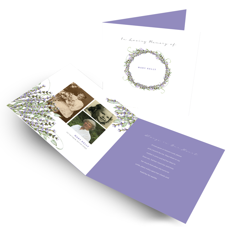 - Our Folded Memorial Acknowledgement cards are finished to size 140mm wide x 140mm high when folded (5.5 in x 5.5 in)