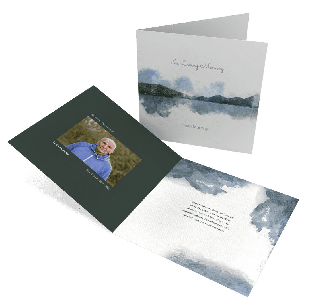 - Our Folded Memorial Acknowledgement cards are finished to size 140mm wide x 140mm high when folded (5.5 in x 5.5 in)