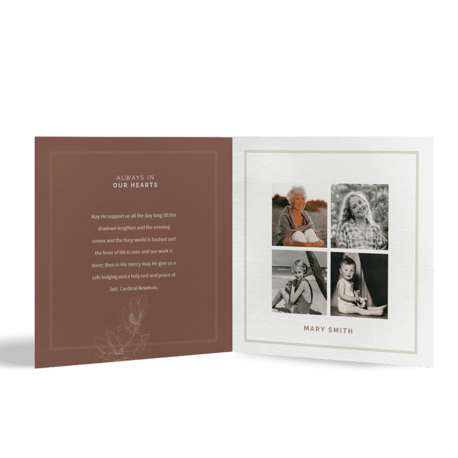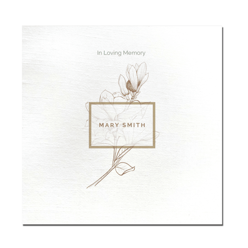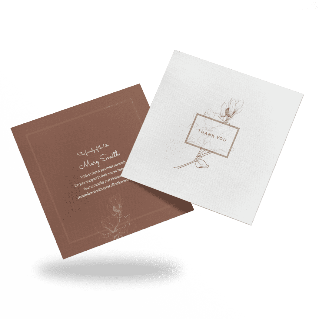 - Our Folded Memorial Acknowledgement cards are finished to size 140mm wide x 140mm high when folded (5.5 in x 5.5 in)