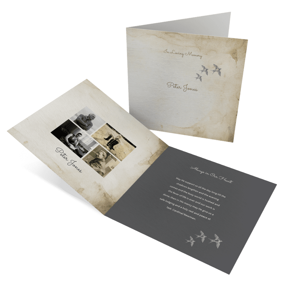 - Our Folded Memorial Acknowledgement cards are finished to size 140mm wide x 140mm high when folded (5.5 in x 5.5 in)