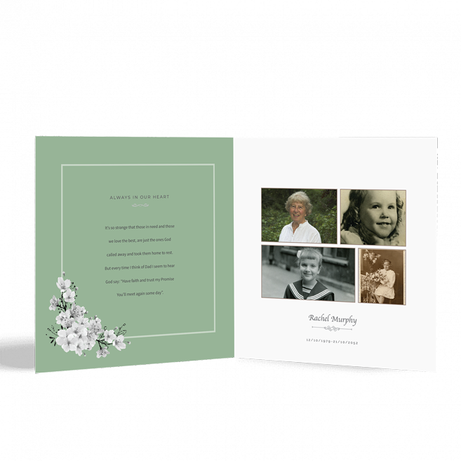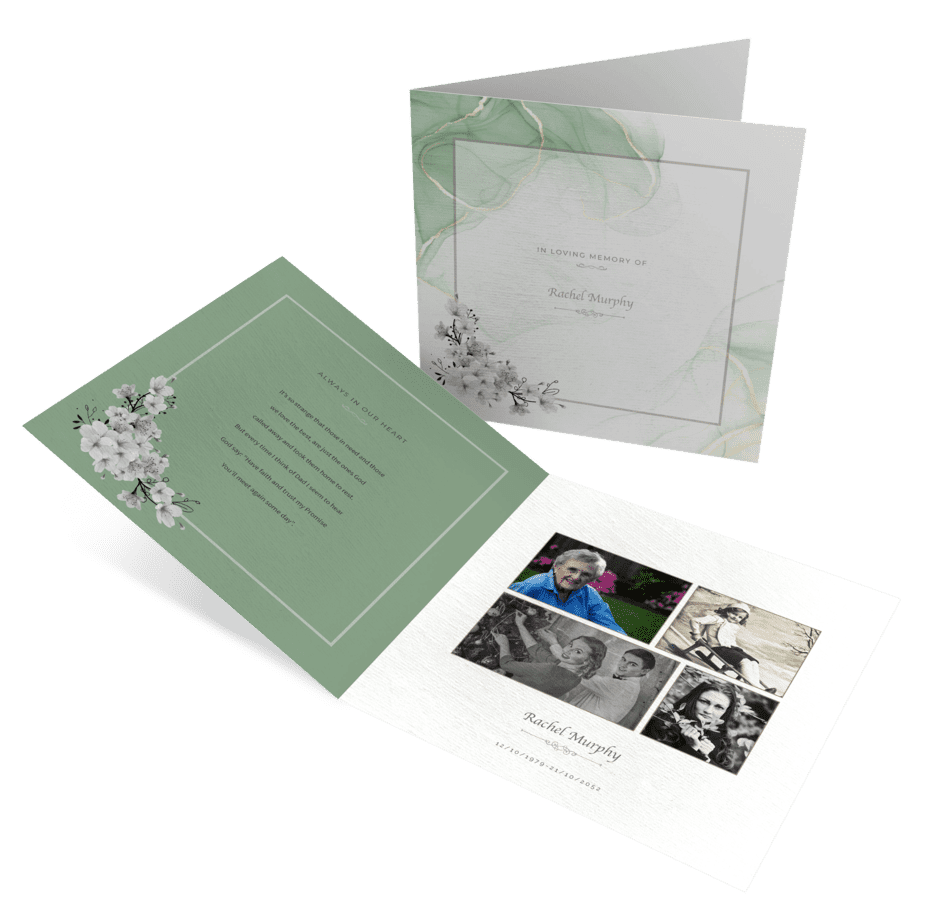 • Our Folded Unique Memorial cards are finished to size 140mm wide x 140mm high when folded