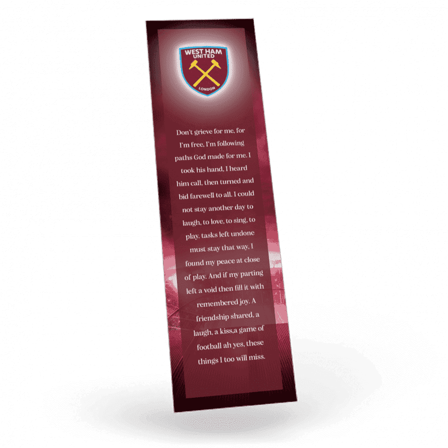 • Our memorial bookmarks are finished to size 55mm x 210mm (Standard Size.)